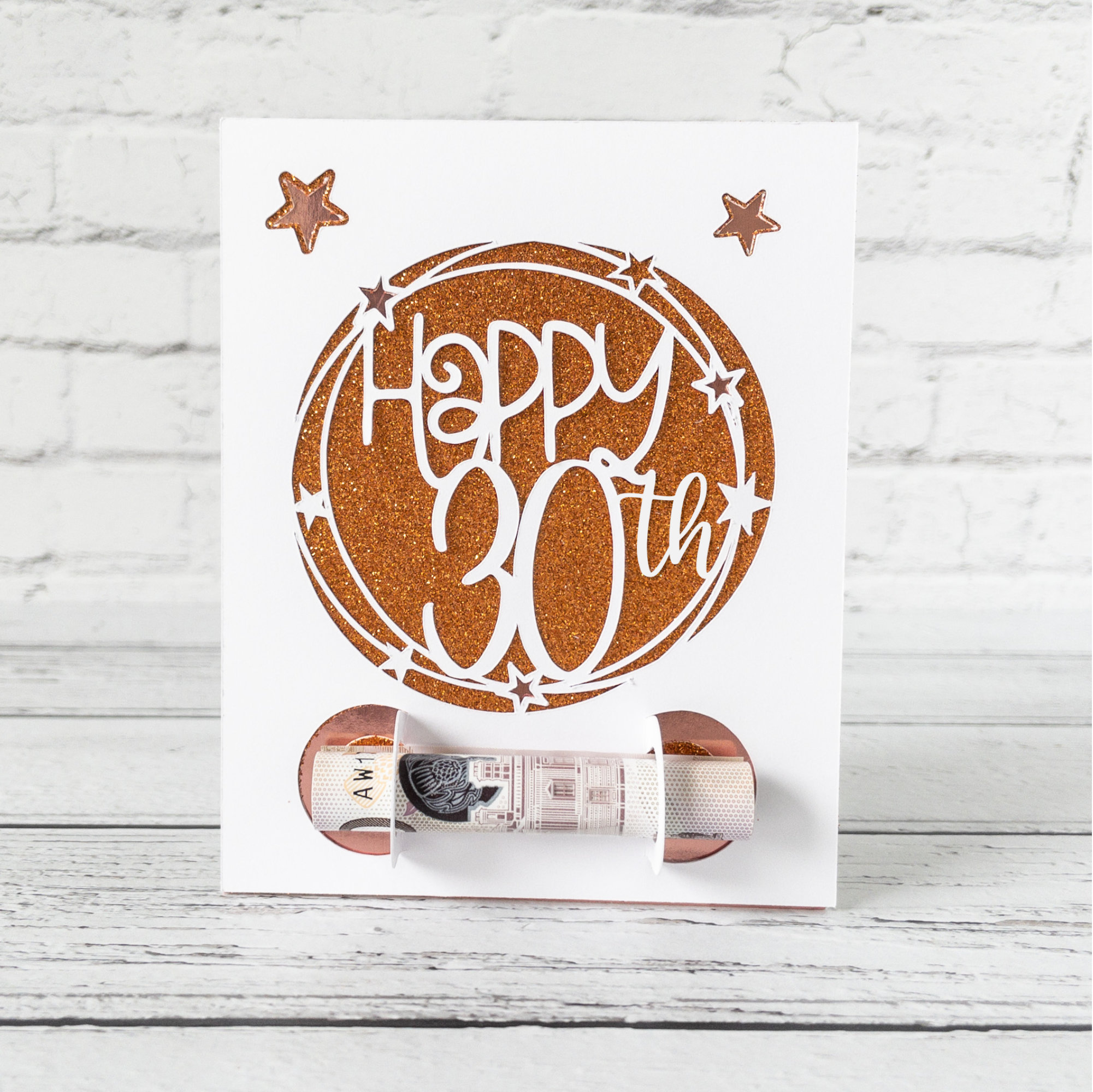 Celebrate turning 30 with this "Happy 30th" money card SVG for Cricut. Featuring "Happy 30th" in a circle with stars, this design comes with a matching gift box template.